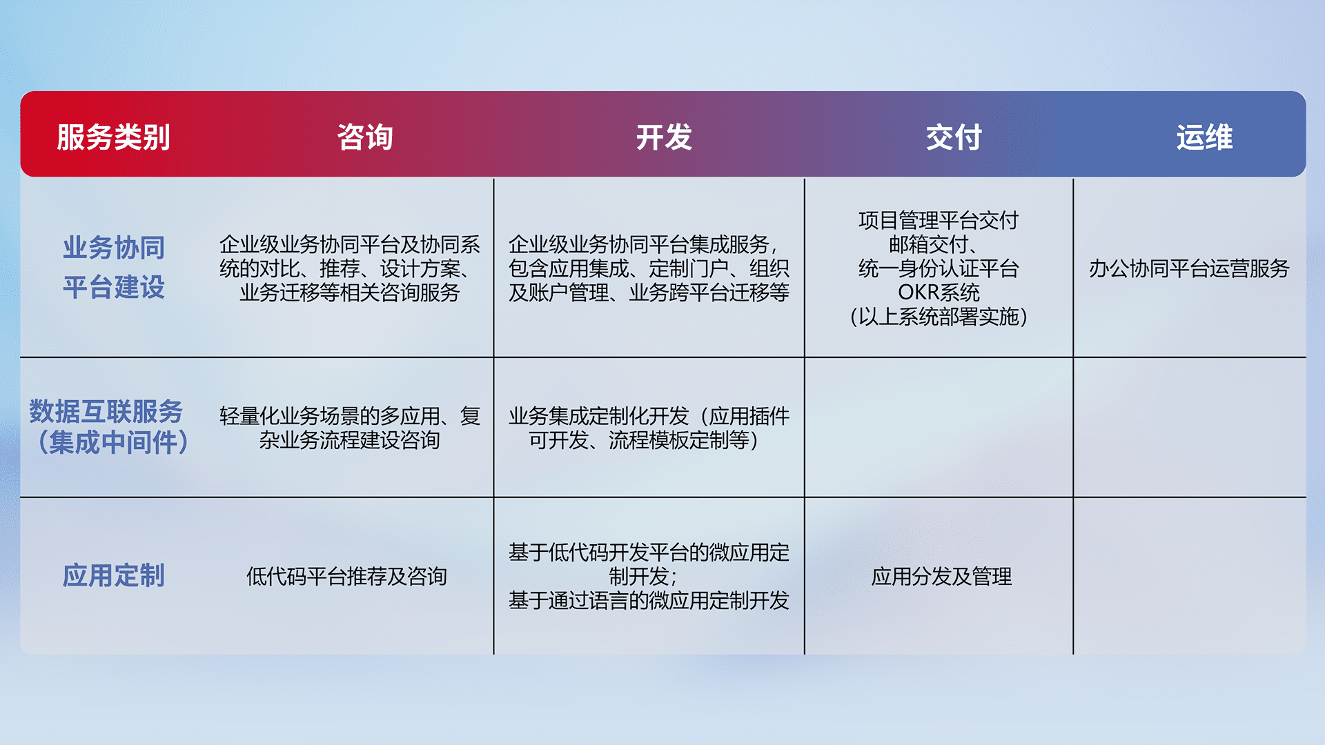 针对钉钉、、、企微、、、、IDaas等平台级产品提供产品的规划、、、、方案、、交付、、、定制化开发等服务,,实现如统一协同办公、、、智能客户服务、、混合会议管理、、、智能数据查询、、、等业务场景,,,,实现数字化转型。。。